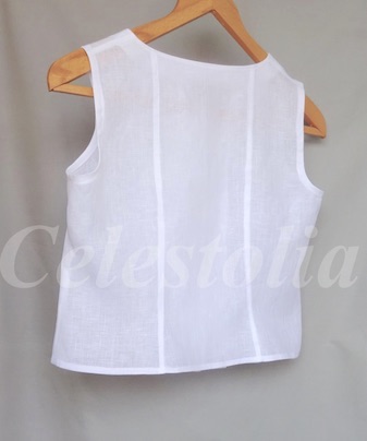 着る人が輝くようなこの小さなブラウスの名は、「ビーナス 金星」。V字型の襟元、前と後ろに切り替えがある構造的な衣はシンプルでエレガント。多少のコルセット効果により、気温が高くても背筋を伸ばしていられます。